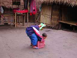 | 次に立ち寄ったのは、モン(HMON)族、タイ人はMeo族と呼んでいる少数民族の村である。行ってみて感じることは、少数民族というより、貧しい村ということである。子どもたちは外国人、特に白人を見ると「何かちょーだい」と手を出し、裸足で追いかけてくる。周辺に立っている家もボロボロである。しかし、そのような家の中に衛星放送を受信するパラポラアンテナがあった。なぜなんだろう。彼らは貧しいのか。それとも、その貧しさは演出なのか。短時間の訪問では本来の彼らの生活を知ることはできないが、彼らの生活を見物に来ている自分という存在を考えると、なにか、イヤな気分になった。 |